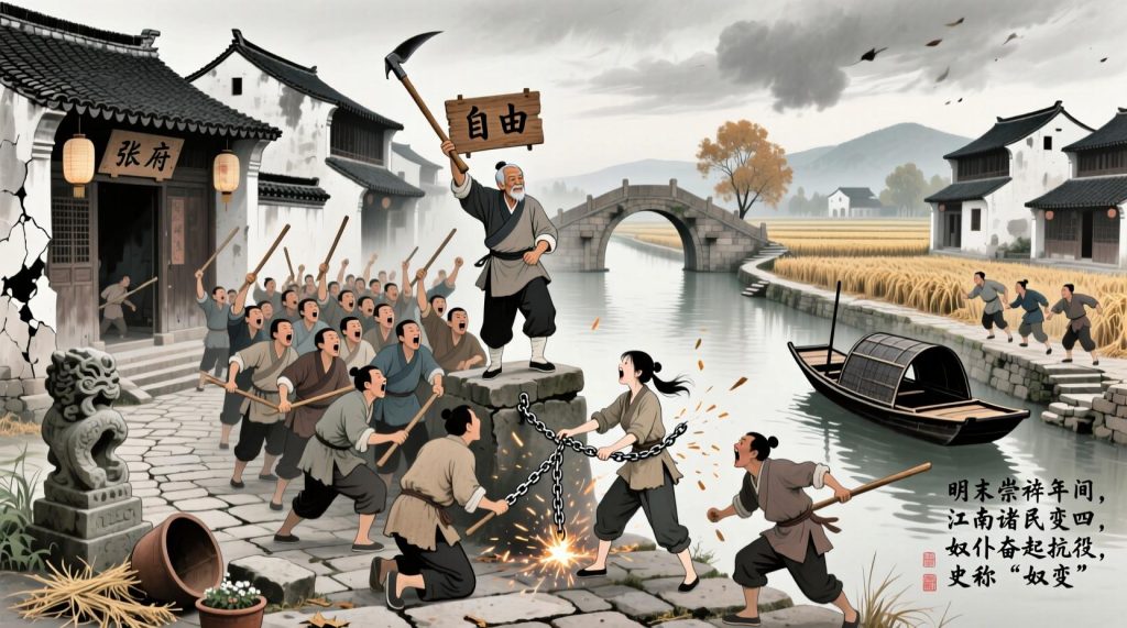 “明末江南奴变”是指明朝末年(17世纪中叶)在江南地区爆发的一系列以奴仆、佃农等底层民众反抗地主、士绅阶级的社会动乱。这些事件通常被称为“奴变”,是明末社会矛盾激化的重要表现之一,具有深刻的社会、经济和政治背景。