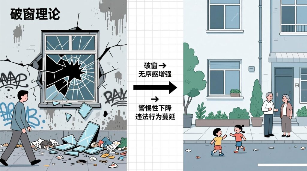 破窗理论认为:如果一个社区中的小问题(如破损的窗户未被修理、涂鸦、乱扔垃圾、轻微违法行为等)得不到及时处理,就会传递出一种“无人管理”或“秩序松散”的信号,从而鼓励更严重的犯罪行为和混乱现象的发生。