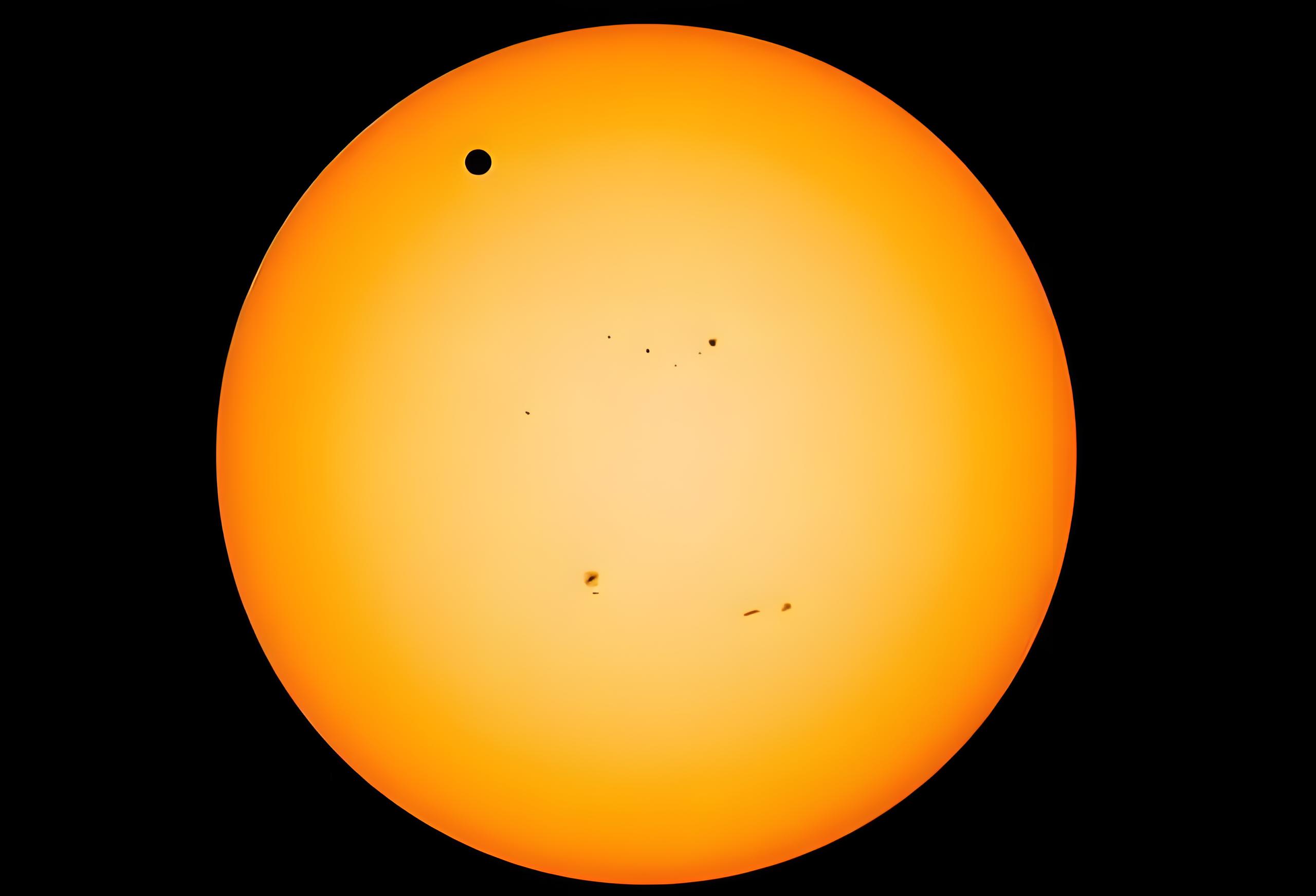 2. **行星凌日**:是指从地球观测,看到一颗内行星(水星或金星)从太阳表面掠过的情景。这种现象发生在行星位于地球和太阳之间,并且三者近乎排成一条直线时。行星凌日时,我们可以从地球上观察到一个小黑点在太阳圆面上缓缓移动。