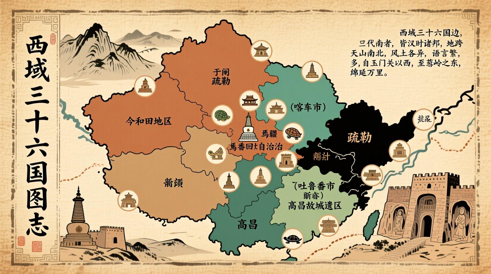 西域三十六国主要指西汉时期位于天山南北,受汉王朝管辖的36个小国。这些小国大多位于今天的新疆地区,但也有一部分位于中亚地区。