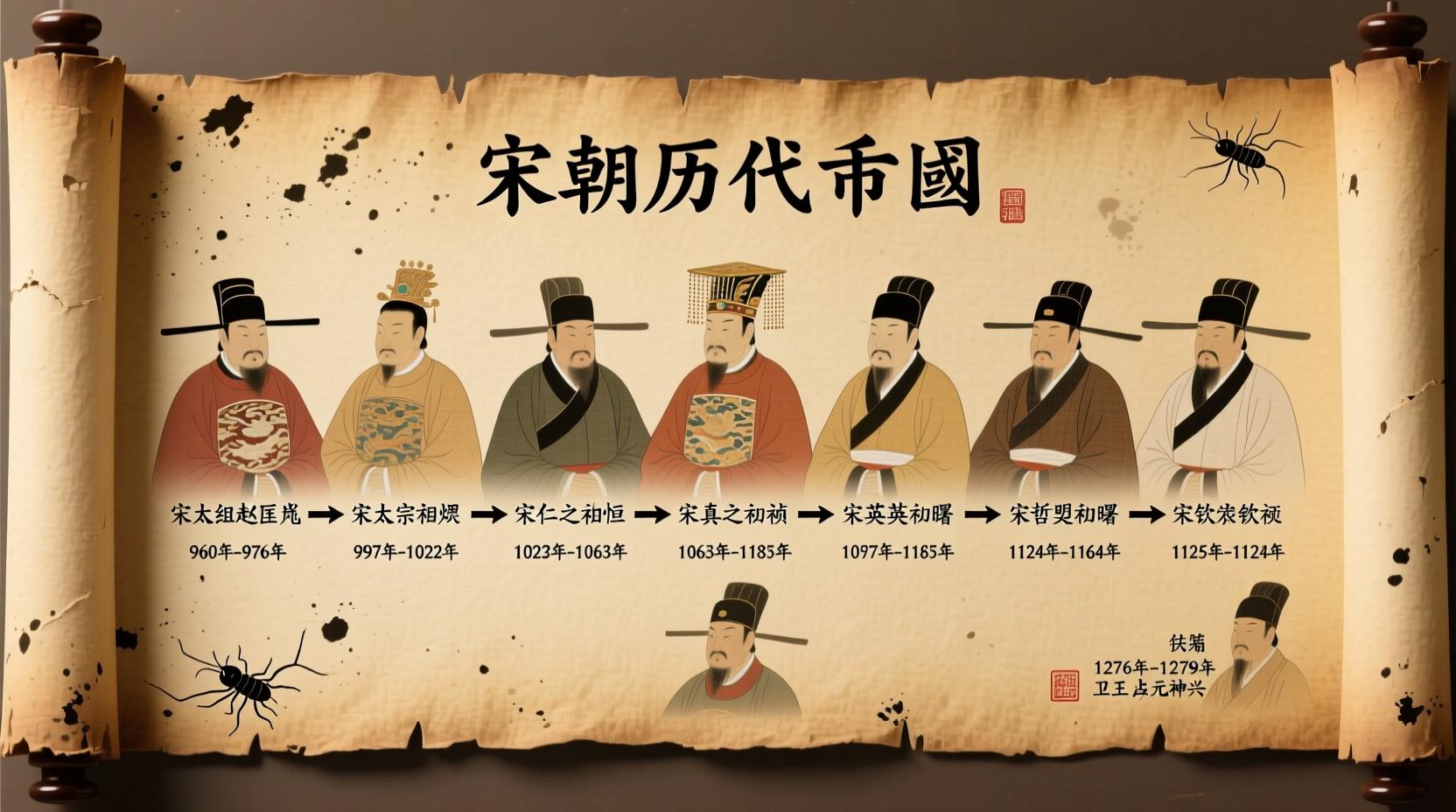 宋朝,从公元960年赵匡胤建立北宋开始,到1279年南宋灭亡,历经18帝,前后共计319年。以下是北宋和南宋的皇帝列表: